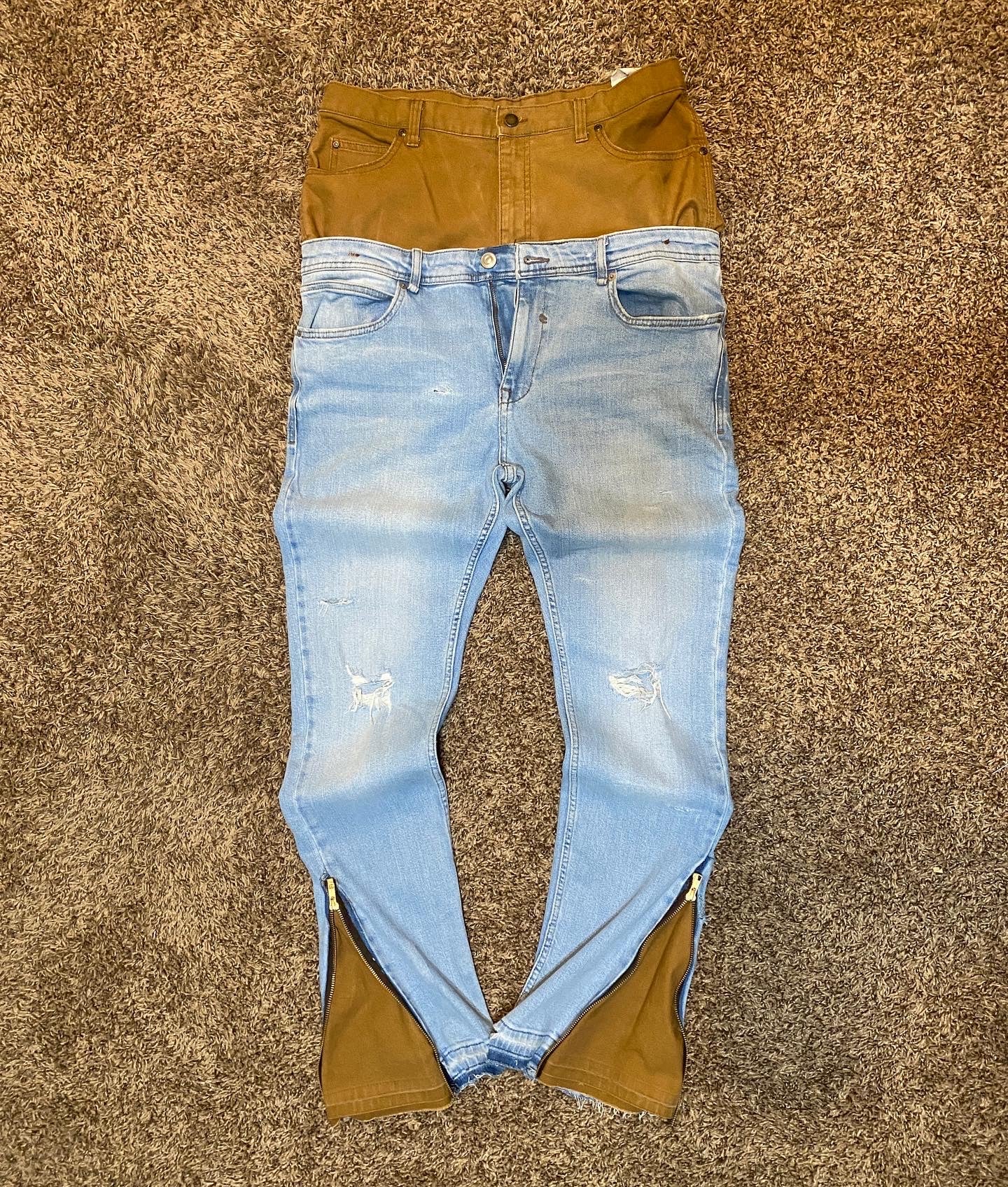 These aren’t your everyday jeans — they’re a handcrafted fusion of style and originality. Designed by merging distressed light-wash denim with a brown Dickies workers pants, this piece redefines streetwear individuality. The extended hem with side zippers adds versatility, while the dual-tone construction makes it a true statement piece.